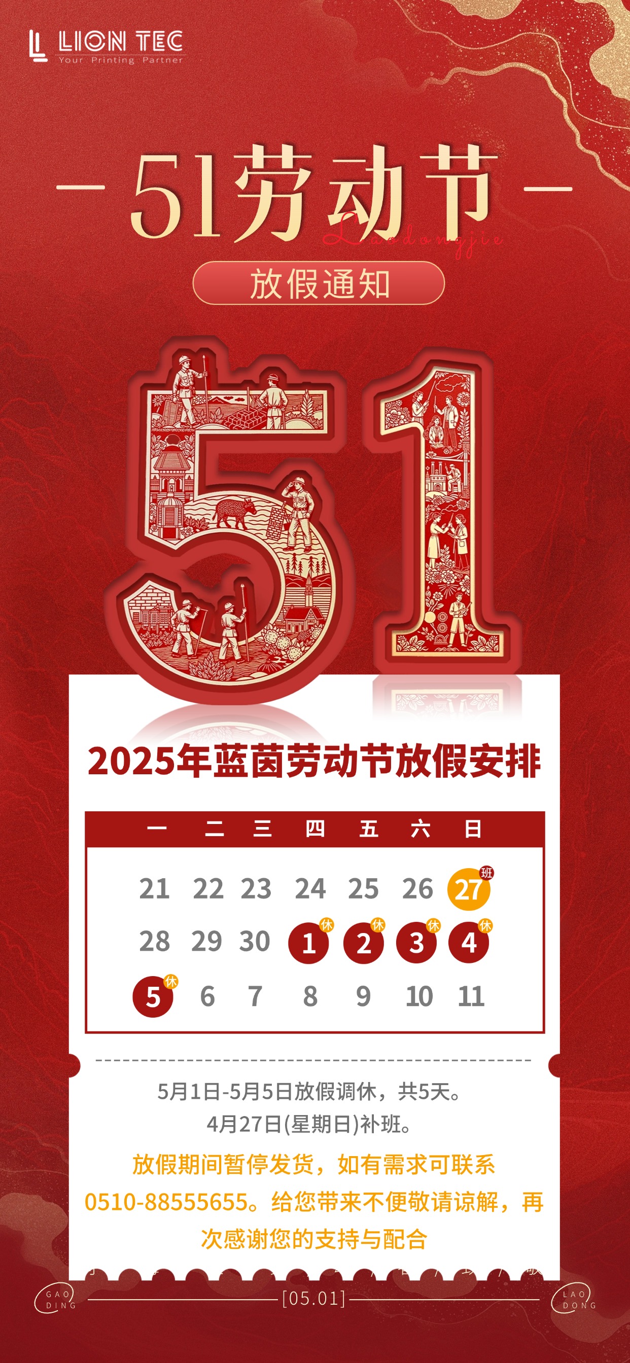 努力前行,不問歸期每一份勞動,都是點亮幸福的光致敬每一位努力奮斗的勞動者五一勞動節(jié)即將到來,根據(jù)國家法定節(jié)假日規(guī)定,噴碼機廠家-藍茵現(xiàn)將2025年勞動節(jié)放假安排通知如下: